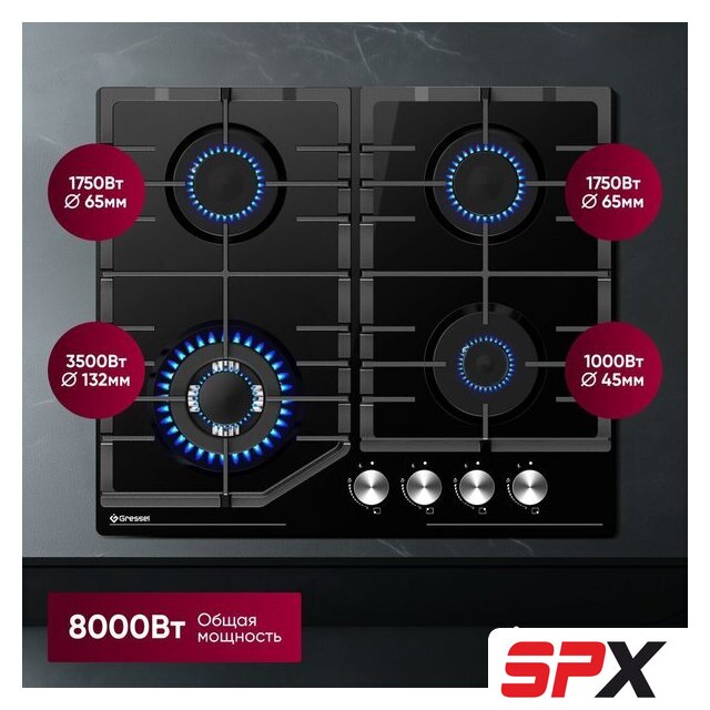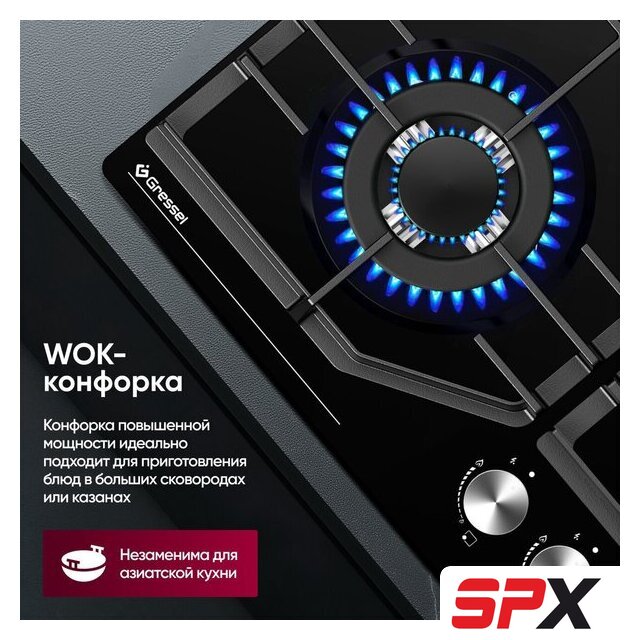 | Подробная информация о конфорках | WOK-конфорка - 3500 Вт (диаметр 132 мм); 2 универсальные конфорки по 1750 Вт (диаметр 65 мм); малая конфорка - 1000 Вт (диаметр 45 мм) |