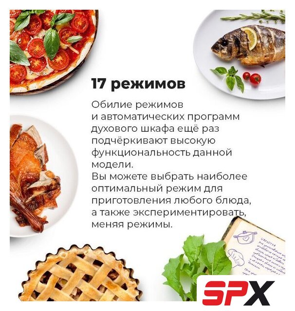 | Режимы работы | нижний нагрев, двухсторонний нагрев, большой гриль, гриль + конвекция, нижний нагрев + конвекция, двухсторонний нагрев + конвекция, размораживание, предварительный разогрев духовки, подготовка теста |