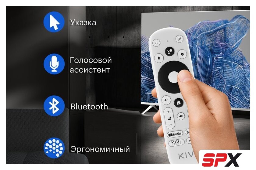 | Пульт в комплекте | KIVI RC60 – серый с голосовым управлением и кнопками Netflix, YouTube |